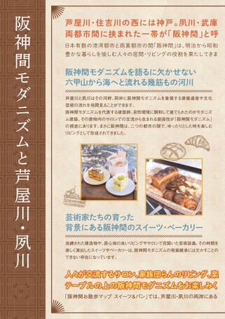 阪神間モダニズムと芦屋川・夙川日本有数の港湾都市と商業都市の間「阪神間」は、明治から昭和豊かな暮らしを愉しむ人々の居間・リビングの役割を果たしてきま芦屋川・住吉川の西には神戸。夙川・武庫両都市間に挟まれた一帯が「阪神間」と呼人々が交流するサロン、家族団らんのリビング、楽テーブルの上の阪神間モダニズムをお楽しみく「阪神間お散歩マップスイーツ&パン」では、芦屋川・夙川の両岸にある阪神間モダニズムを語るに欠かせない六甲山から海へと流れる幾筋もの河川芦屋川と夙川はその河畔、両岸に阪神間モダニズムを象徴する建築遺産や文化芸術の流れを垣間見ることができます。阪神間モダニズムを代表する建築群。自然環境に調和して建てられたのがモダニズム建築。その建物内のサロンでの交流から生まれる創造性が「阪神間モダニズム」の根底にあります。まさに阪神間は、二つの都市の間で、ゆったりとした時を楽しむリビングとして形成されてきました。芸術家たちの育った背景にある阪神間のスイーツ・ベーカリー洗練された建造物や、居心地の良いリビングやサロンで花開いた芸術談義。その時間を楽しく演出したスイーツやベーカリーは、阪神間モダニズムの発展継承には欠かすことのできない存在になっています。