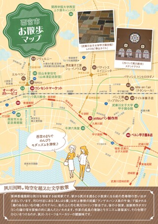 82221714343西宮駅西宮駅甲子園口駅JR神戸線阪急神戸線阪急今津線阪急甲陽線阪神本線阪神武庫川線今津駅久寿川駅阪神国道駅門戸厄神駅打出駅香櫨園駅さくら夙川駅夙川駅西宮北口駅甲子園駅鳴尾・武庫川女子大前駅武庫川駅東鳴尾駅洲崎駅武庫川団地前駅甲陽園駅苦楽園口駅山手幹線甲子園球場鳴尾御影線甲子園筋新堀川旧国道臨港線小曽根線武庫川本郷学文筋越木岩筋旧国道臨港線酒蔵通り旧西国街道苦楽園口通夙川オアシスロード西宮市立郷土資料館笹倉鉄平ちいさな絵画館武庫大橋火垂るの墓記念碑(西宮震災記念碑公園)上田安子記念館西宮市貝類館建石筋札場筋中津浜線名神高速西宮市ベルン甲子園本店08エルベラン21パン工房リップカレント36yotsuパン製作所11西宮市大谷記念美術館20オー・ボン・ガトー・ビゴ09武庫川女子大学甲子園会館12今津六角堂13旧山本家住宅(山本清記念財団)22関西学院大学西宮上ケ原キャンパス15ジヴェルニー23パティシエエイジニッタ31西北菓子工房シェ・イノウエ35コンセントマーケット10torico37ライト洋菓子店32têteenl'air(テタンレール)33カトリック夙川教会14パティシエトシヒロタダノ34《武庫川女子大学甲子会館》レトロな「泰山タイル」《カトリック夙川教会》ステンドグラス西宮のまちでのんびりモダニズムを満喫♪阪神香櫨園駅は夙川を堪能する始発駅です。駅から夙川を遡ると小説家になる前の思春期の思い出が点在しています。河口付近にある「あしはら橋」は村上春樹の短編『ランゲルハンス島の午後』で描かれる「趣のある古い石の橋」のモデルに。坂の上に佇む夙川カトリック教会では、後の小説家、遠藤周作がカリヨンの鐘の塔を探検の的に遊んだといわれます。作家の成長の筆跡とモダニズム建築巡り。その合間でひといきつけるのが、夙川・スイーツ&ベーカリーの醍醐味です。
