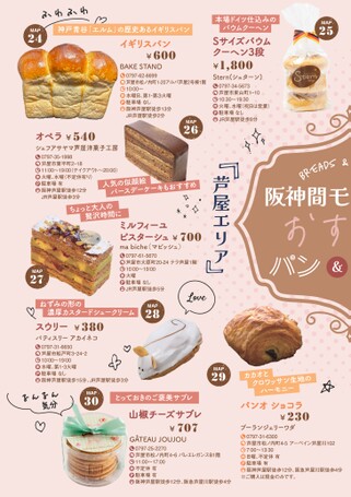24MAP25MAP26MAP28MAP30MAP29MAP27MAPイギリスパン600¥0797-62-6699芦屋市松ノ内町1-20アルパ芦屋2号棟1階10:00〜水曜日、第1・第3火曜駐車場なし阪神芦屋駅徒歩13分JR芦屋駅徒歩2分BAKESTAND0797-61-5670芦屋市大原町20-24テラ芦屋1階10:00〜19:00火曜駐車場なしJR芦屋駅徒歩5分mabiche(マビッシュ)0797-31-6300芦屋市松ノ内町4-5アーベイン芦屋川1027:00〜13:30日曜、不定休有駐車場有阪神芦屋駅徒歩12分、阪急芦屋川駅徒歩4分ブーランジェリーワダ707¥380¥ふわふわLoveSサイズバウムクーヘン3段1,800¥0797-34-5673芦屋市東山町11010:30〜19:30火曜、水曜(祝日は営業)駐車場なしJR芦屋駅徒歩8分Stern(シュターン)オペラ540¥0797-35-1998芦屋市業平町21811:00〜19:00(テイクアウト〜20:00)火曜、水曜(不定休有り)駐車場有阪神芦屋駅徒歩12分JR芦屋駅徒歩3分シェフアサヤマ芦屋洋菓子工房0797-31-6650芦屋市船戸町324210:00〜19:00水曜、第1・3火曜駐車場なし阪神芦屋駅徒歩15分、JR芦屋駅徒歩3分パティスリーアカイネコパンオショコラ230¥ミルフィーユピスターシュ700¥スウリー0797-25-2270芦屋市松ノ内町46パレエレガンスB1階11:00〜17:00不定休有駐車場有阪神芦屋駅徒歩12分、阪急芦屋川駅徒歩4分GÂTEAUJOUJOU山椒チーズサブレ神戸青谷「エルム」の歴史あるイギリスパンとっておきのご褒美サブレねずみの形の濃厚カスタードシュークリームちょっと大人の贅沢時間に人気の似顔絵バースデーケーキもおすすめ本場ドイツ仕込みのバウムクーヘンるんるん気分芦屋エリア阪神間モダおすすパン&Breads&カカオとクロワッサン生地のハーモニー※ご購入は現金のみです。