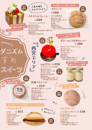 35MAP34MAP36MAP37MAP31MAP33MAP32MAP0798-67-2963西宮市甲子園口2丁目3309:30〜19:00木曜駐車場なし阪神甲子園駅から阪神バスでJR甲子園口下車、徒歩2分ライト洋菓子店0798-64-0808西宮市北口町8-1510:00〜18:30火曜(祝日の場合は翌日休)、月曜不定休駐車場有阪急西宮北口駅徒歩3分パティシエエイジニッタ0798-67-6322西宮市二見町13-191階10:00〜20:00月曜(祝日の場合翌日)駐車場なし阪神甲子園駅から阪神バスでJR甲子園口下車、徒歩4分パティシエトシヒロタダノ0798-62-3590西宮市二見町122011:00〜20:00年中無休駐車場なし阪神甲子園駅から阪神バスでJR甲子園口下車、徒歩3分têteenl'airテタンレール)0798-63-7240西宮市甲子園口3丁目4-357:30〜18:00木曜・日曜駐車場なし阪神甲子園駅から阪神バスでJR甲子園口下車、徒歩3分パン工房リップカレントエビ入チーズ130¥0798-73-0818西宮市大井手町368:00〜19:00日曜、月曜駐車場なし阪神香櫨園駅徒歩14分、阪急夙川駅徒歩3分toricoバケットサンド313¥味のあるバケットで分厚いベーコンをサンドマドレーヌ200¥甲子園ホテルの想い出の味maiプリン320¥0798-69-3128西宮市南昭和町21510:00〜19:00月曜、火曜不定休駐車場有阪急西宮北口駅徒歩4分西北菓子工房シェ・イノウエ合格マドレーヌ210¥硬すぎず柔らかすぎない懐かしのバニラ風味「合格」焼印入り、受験生応援スイーツダリ〜りんごと紅茶のムース〜486¥リンゴムースの甘酸っぱさとムースの滑らかさが格別黒ごまと干しエビの香りに誘われてイチゴミルフィーユ580¥サクサクのパイと3種の甘酸っぱいゼリーのハーモニー西宮エリア人気の味をたんのうしようボリュームまんてん!モダニズムすすめスイーツsweets