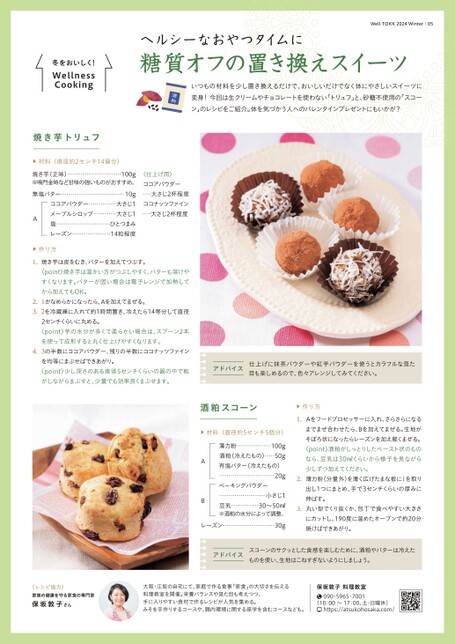 WellTOKK2024Winter|05スコーンのサクッとした食感を楽しむために、酒粕やバターは冷えたものを使い、生地はこねすぎないようにしましょう。アドバイス仕上げに抹茶パウダーや紅芋パウダーを使うとカラフルな見た目も楽しめるので、色々アレンジしてみてください。アドバイス大阪・江坂の自宅にて、家庭で作る食事「家食」の大切さを伝える料理教室を開催。栄養バランスや見た目も考えつつ、手に入りやすい食材で作るレシピが人気を集める。みそを手作りするコースや、腸内環境に関する座学を含むコースなども。家族の健康を守る家食の専門家〈レシピ協力〉保坂敦子さん保坂敦子料理教室(cid:8)(cid:4)090・5965・7001(10:00〜17:00、土・日曜休)(cid:10)(cid:4)https://atsukohosaka.com/WellnessCooking冬をおいしく!▶作り方ヘルシーなおやつタイムに糖質オフの置き換えスイーツ〈仕上げ用〉ココアパウダー・・・・大さじ2杯程度ココナッツファイン・・・・大さじ2杯程度焼き芋(正味)・・・・・・・・・・・・・・・・・・・・・・・・・・・・100g※鳴門金時など甘味の強いものがおすすめ。無塩バター・・・・・・・・・・・・・・・・・・・・・・・・・・・・・・・・・10gココアパウダー・・・・・・・・・・・・・・大さじ1メープルシロップ・・・・・・・・・・・・大さじ1塩・・・・・・・・・・・・・・・・・・・・・・・・・・・・ひとつまみレーズン・・・・・・・・・・・・・・・・・・・・14粒程度A酒粕スコーン▶材料(直径約2センチ14個分)焼き芋トリュフいつもの材料を少し置き換えるだけで、おいしいだけでなく体にやさしいスイーツに変身!今回は生クリームやチョコレートを使わない「トリュフ」と、砂糖不使用の「スコーン」のレシピをご紹介。体を気づかう人へのバレンタインプレゼントにもいかが?1.焼き芋は皮をむき、バターを加えてつぶす。〈point〉焼き芋は温かい方がつぶしやすく、バターも溶けやすくなります。バターが固い場合は電子レンジで加熱してから加えてもOK。2.1がなめらかになったら、Aを加えてまぜる。3.2を冷蔵庫に入れて約1時間置き、冷えたら14等分して直径2センチくらいに丸める。point〉芋の水分が多くて柔らかい場合は、スプーン2本を使って成形すると丸く仕上げやすくなります。4.3の半数にココアパウダー、残りの半数にココナッツファインを均等にまぶせばできあがり。point〉少し深さのある直径5センチくらいの器の中で転がしながらまぶすと、少量でも効率良くまぶせます。薄力粉・・・・・・・・・・・・・・・・・・100g酒粕(冷えたもの)・・・・・50g有塩バター(冷えたもの)・・・・・・・・・・・・・・・・・・・・・・・・・・・・・20gベーキングパウダー・・・・・・・・・・・・・・・・・・・・・・・・小さじ1豆乳・・・・・・・・・・・・・・30〜50㎖※酒粕の水分によって調整。レーズン・・・・・・・・・・・・・・・・・・・・・・・・・・・30gBA1.Aをフードプロセッサーに入れ、さらさらになるまでまぜ合わせたら、Bを加えてまぜる。生地がそぼろ状になったらレーズンを加え軽くまぜる。point〉酒粕がしっとりしたペースト状のものなら、豆乳は30㎖くらいから様子を見ながら少しずつ加えてください。2.薄力粉(分量外)を薄く広げたまな板に1を取り出し1つにまとめ、手で3センチくらいの厚みに伸ばす。3.丸い型でくり抜くか、包丁で食べやすい大きさにカットし、190度に温めたオーブンで約20分焼けばできあがり。▶材料(直径約5センチ5個分)▶作り方