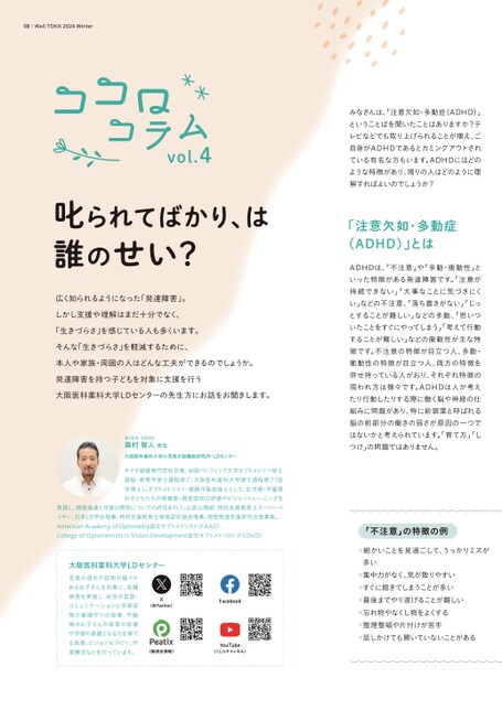 みなさんは、「注意欠如・多動症(ADHD)」ということばを聞いたことはありますか?テレビなどでも取り上げられることが増え、ご自身がADHDであるとカミングアウトされている有名な方もいます。ADHDにはどのような特徴があり、周りの人はどのように理解すればよいのでしょうか?ADHDは、「不注意」や「多動・衝動性」といった特徴がある発達障害です。「注意が持続できない」「大事なことに気づきにくい」などの不注意、「落ち着きがない」じっとすることが難しい」などの多動、思いついたことをすぐにやってしまう」「考えて行動することが難しい」などの衝動性が主な特徴です。不注意の特徴が目立つ人、多動・衝動性の特徴が目立つ人、両方の特徴を併せ持っている人がおり、それぞれ特徴の現われ方は様々です。ADHDは人が考えたり行動したりする際に働く脳や神経の仕組みに問題があり、特に前頭葉と呼ばれる脳の前部分の働きの弱さが原因の一つではないかと考えられています。「育て方」しつけ」の問題ではありません。キクチ眼鏡専門学校卒業、米国パシフィック大学オプトメトリー修士課程・教育学修士課程修了、大阪医科薬科大学博士課程修了(医学博士)。オプトメトリスト・眼鏡作製技能士として、幼児期・学童期の子どもたちの視機能・視覚認知の評価やビジョントレーニングを実践し、視覚発達と学習の関係についての研究を行う。公認心理師、特別支援教育士スーパーバイザー、日本LD学会理事、特別支援教育士資格認定協会理事、視覚発達支援研究会理事長。AmericanAcademyofOptometry認定オプトメトリスト(FAAO)CollegeofOptometristsinVisionDevelopment認定オプトメトリスト(FCOVD)奥村智人先生大阪医科薬科大学小児高次脳機能研究所・LDセンターおくむらともひとvol.4言葉の遅れや認知の偏りがあるお子さんを対象に、各種検査を実施し、幼児の言語・コミュニケーションと学習姿勢の基礎作りの指導、学齢期のお子さんの言葉の指導や学習の基礎となる力を育てる指導、ビジョンセラピー、作業療法などを行っています。大阪医科薬科大学LDセンターX(旧Twitter)Facebook(講演会情報)YouTube(くじらチャンネル)「不注意」の特徴の例●細かいことを見過ごして、うっかりミスが多い●集中力がなく、気が散りやすい●すぐに飽きてしまうことが多い●最後までやり遂げることが難しい●忘れ物やなくし物をよくする●整理整頓や片付けが苦手●話しかけても聞いていないことがある叱られてばかり、は誰のせい?広く知られるようになった「発達障害」。しかし支援や理解はまだ十分でなく、「生きづらさ」を感じている人も多くいます。そんな「生きづらさ」を軽減するために、本人や家族・周囲の人はどんな工夫ができるのでしょうか。発達障害を持つ子どもを対象に支援を行う大阪医科薬科大学LDセンターの先生方にお話をお聞きします。「注意欠如・多動症(ADHD)」とは08|WellTOKK2024Winter