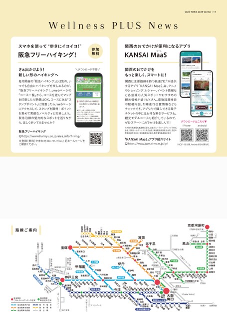 路線ご案内〈大阪モノレール〉富田総持寺南茨木摂津市正雀相川上新庄淡路崇禅寺〈北大阪急行〉園田神崎川雲雀丘花屋敷山本清荒神売布神社中山観音武庫之荘夙川芦屋川岡本御影六甲王子公園春日野道武庫川尼崎センタープール前出屋敷尼崎大物杭瀬伝法千鳥橋西九条九条ドーム前桜川千船姫島淀川野田福島〈神戸市営地下鉄〉福〈京都市営地下鉄〉〈神戸市営地下鉄〉烏丸大宮西院西京極松尾大社上桂桂嵐山京都河原町洛西口東向日西向日長岡天神西山天王山大山崎水無瀬上牧高槻市門真市天神橋筋六丁目〈OsakaMetro〉東梅田西梅田梅田近鉄奈良〈近鉄〉なんば下新庄吹田豊津関大前千里山南千里山田万博記念公園彩都西柴島南方新大阪江坂西中島南方〈新幹線〉服部天神庄内三国蛍池豊中岡町曽根稲野新伊丹伊丹大阪空港箕面牧落桜井石橋阪大前池田宝塚日生中央宝塚南口逆瀬川小林仁川甲東園門戸厄神西宮北口今津阪神国道苦楽園口神戸三宮甲陽園新神戸三宮〈新幹線〉花隈〈神戸電鉄〉〈神戸市営地下鉄〉湊川元町西元町高速神戸大開高速長田西代〈山陽電車〉山陽網干山陽姫路東鳴尾洲先出来島大阪難波武庫川団地前マリンパーク神戸空港〈六甲ライナー〉〈ポートライナー〉〈嵐電〉十三神戸高速線中津大阪梅田大阪梅田神戸三宮川西能勢口絹延橋滝山鴬の森鼓滝大石新在家石屋川御影住吉魚崎青木深江芦屋打出香櫨園西宮今津久寿川鳴尾・武庫川女子大前甲子園茨木市多田平野一の鳥居畦野山下笹部光風台ときわ台妙見口春日野道西灘岩屋千里中央新開地北千里塚口PRESENT右記二次元コードまたはURLへアクセスし、プレゼント番号(1〜4の中から1つ)、郵便番号、住所、氏名、年齢、性別、職業、電話番号と、質問(右記)の答えを入力のうえ、ご応募ください。応募はお1人様一回限りです。[応募フォーム](cid:10)(cid:4)https://req.qubo.jp/hhms/form/welltokk32[締切]2月29日(木)23:59※抽選のうえ、発表は発送をもってかえさせていただきます。※アンケート内容及び住所等の個人情報は、誌面の充実、プレゼントを発送する目的に限り利用します。また、プレゼントの内容によっては、プレゼント提供元から直接、当選者に発送することがあります。①今号で面白かったページとその理由を具体的に②今後読んでみたい健康に関する特集記事③WellTOKKの入手場所(駅の場合は駅名を明記)[11ページ]阪急ハイキングノベルティセット2名様14[2ページ]亀屋良長本店吉村和菓子店「焼き鳳瑞〈あづき茶〉9個桐箱入り」2名様3[10ページ]福岡伸一先生サイン付き集英社「音楽と生命」著者:坂本龍一、福岡伸一2名様2朝日出版社「生命海流」著者:福岡伸一2名様WellnessPLUSNews関西のおでかけをもっと楽しく、スマートに!関西のおでかけが便利になるアプリKANSAIMaaSマース「KANSAIMaaS」アプリ紹介サイト(cid:10)(cid:4)https://www.kansai-maas.jp/lp/関西に主要路線を持つ鉄道7社※が提供するアプリ「KANSAIMaaS」は、グルメやショッピング、レジャー、イベント情報など各沿線の人気スポットやおすすめの観光情報が盛りだくさん。乗換経路検索や駅構内図、列車走行位置情報などもチェックでき、アプリ内で購入できる電子チケットの中にはお得な割引サービスも。観光モデルコースも紹介しているので、ぜひスマートにおでかけを楽しんで!※大阪市高速電気軌道株式会社、近鉄グループホールディングス株式会社、京阪ホールディングス株式会社、南海電気鉄道株式会社、西日本旅客鉄道株式会社、阪急電鉄株式会社、阪神電気鉄道株式会社ダウンロードはこちら▼iPhoneandroid※iOS14.0以降、Android9.0以降対応※登録(無料)や参加方法については上記ホームページをご確認ください。さぁ出かけよう!新しい形のハイキングへスマホを使って“歩きにイコイコ!”阪急フリーハイキング!阪急フリーハイキング(cid:10)(cid:4)https://www.hankyu.co.jp/area_info/hiking/\ダウンロード不要/毎月開催の「阪急ハイキング」とは別の、いつでも自由にハイキングを楽しめるのが、「阪急フリーハイキング!」。webページの「コース一覧」から、コースを選んでマップを印刷したら準備はOK。コースにある「スタンプポイント」に到着したら、webページにアクセスして、スタンプを獲得!ポイントを集めて素敵なノベルティと交換しよう。阪急沿線の魅力的なスポットを巡りながら、楽しく歩いてみませんか?参加無料WellTOKK2024Winter|11